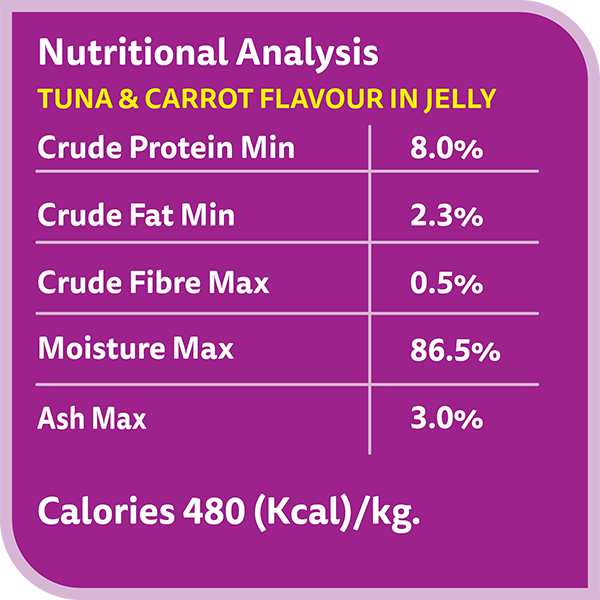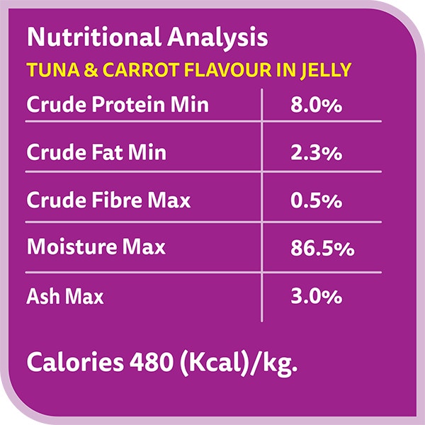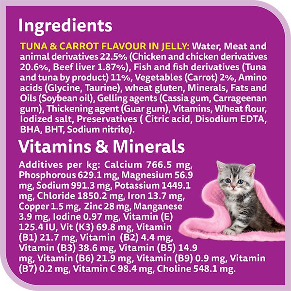 Whiskas® Tasty Mix Junior Tuna and Salmon and Pumpkin Flavour in Jelly 6 x 70g and Whiskas® Tasty Mix Junior Tuna and Carrot Flavour in Jelly 6 x 70g are complete and balanced wet cat food that provide 100% of your kitten's daily needs.